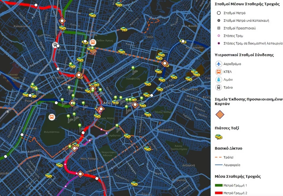 το βασικό δίκτυο γραμμών και στάσεων του ΟΑΣΑ (λεωφορεία, τρόλεϊ, μετρό, τραμ),