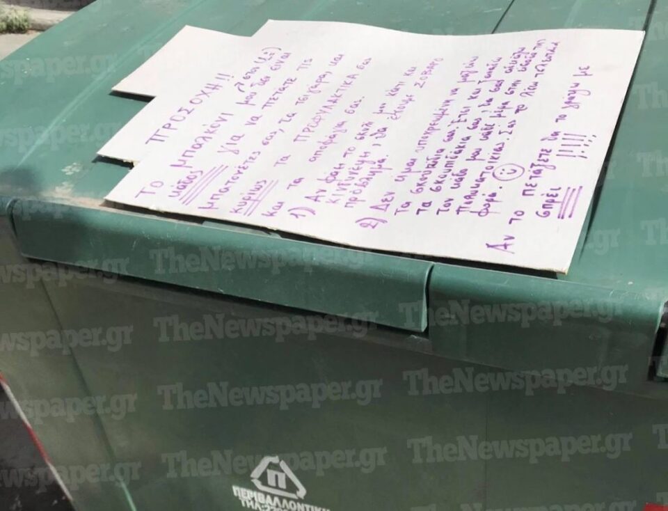 Ο αγανακτισμένος κάτοικος έγραψε μία μεγάλη επιγραφή και την κόλλησε στον κάδο απορριμμάτων της γειτονιάς, ώστε να γίνει σαφές σε όλους οτι δεν πρόκειται να ανεχθεί άλλο αυτή την κατάσταση!