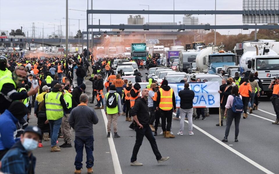 Ήταν η δεύτερη ημέρα διαδηλώσεων στην αυστραλιανή πόλη που τελεί σε καθεστώς lockdown αφού οι αρχές έκλεισαν τα εργοτάξια για δύο εβδομάδες, λέγοντας ότι οι συχνές μετακινήσεις των εργαζομένων εξαπλώνουν τον κορονοϊό.