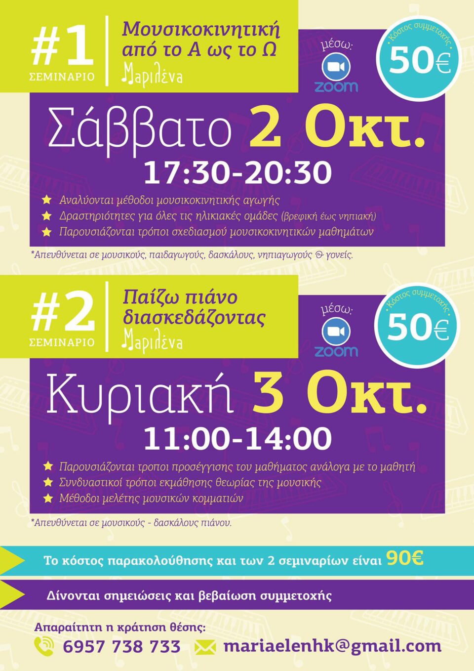 Με νέα σεμινάρια για εκπαιδευτικούς, μουσικούς, μουσικοπαιδαγωγούς, νηπιαγωγούς και γονείς ξεκινάει η νέα σχολική χρονιά. Το Σαββατοκύριακο 2 & 3 Οκτωβρίου, μέσα από την εφαρμογή zoom μπορείτε να παρακολουθήσετε νέες ιδέες και μεθόδους με τις οποίες μπορείτε να εμπλουτίσετε τις ιδέες σας, πραγματοποιώντας ένα δημιουργικό μάθημα μουσικοκινητικής και δημιουργώντας ένα διασκεδαστικό μάθημα πιάνου, μέσω του οποίου τα παιδιά θα γνωρίσουν το μουσικό τους όργανο και θα το αγαπήσουν μέσα από προτεινόμενα παιχνίδια για το πιάνο, τη θεωρία, το Σολφέζ αλλά και την ιστορία της μουσικής.