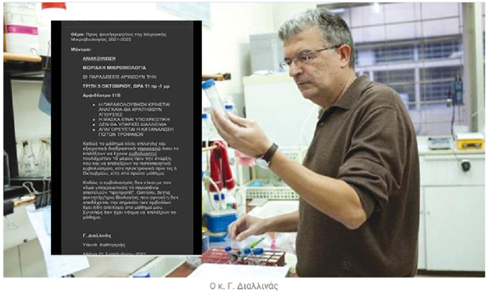Ο κ. Διαλλινάς ενημερώνει τους φοιτητές ότι, αν επιλέξουν να παρακολουθήσουν το μάθημά του, η παρουσία τους σε αυτό είναι υποχρεωτική (σωστό) αλλά και πως θα πρέπει να είναι εμβολιασμένοι. Ο κ. καθηγητής, αφού επισημαίνει -και ορθώς- πως ο εμβολιασμός των φοιτητών δεν είναι υποχρεωτικός και πως όλα τα παραπάνω είναι απλώς «προτροπή», υπογραμμίζει με έμφαση ότι, αν ένας τριτοετής φοιτητής στη Μοριακή Βιολογία δεν αντιλαμβάνεται τη σημασία των εμβολίων, τότε δεν χρειάζεται να παρακολουθήσει το μάθημά του.Remaining Time-0:00FullscreenMute