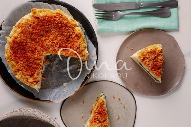 Στρώνω το αλλαντικό, το σπανάκι και την τριμμένη μοτσαρέλα. Με ένα κουταλάκι ρίχνω τον υπόλοιπο πουρέ σε μικρές δόσεις για να καλύψω την επιφάνεια χωρίς όμως να ισιώσω. Αφήνω την επιφάνεια «άγρια» αλλά να καλύπτει εντελώς την γέμιση. Ανακατεύω το λιωμένο βούτυρο με την φρυγανιά και ρίχνω το μείγμα πασπαλιστά. Σκορπίζω λίγους κύβους βουτύρου ακόμη και ψήνω στο φούρνο για 1 ώρα μέχρι να ροδίσει η επιφάνεια και να γίνει τραγανή η κρούστα.