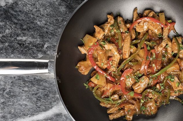 - Μεταφέρουμε το κρέας και τα λαχανικά περιμετρικά στο γουόκ, ρίχνουμε τη σάλτσα στο κέντρο του, ανακατεύουμε, και αφήνουμε για 2-3 λεπτά να πήξει λίγο.
