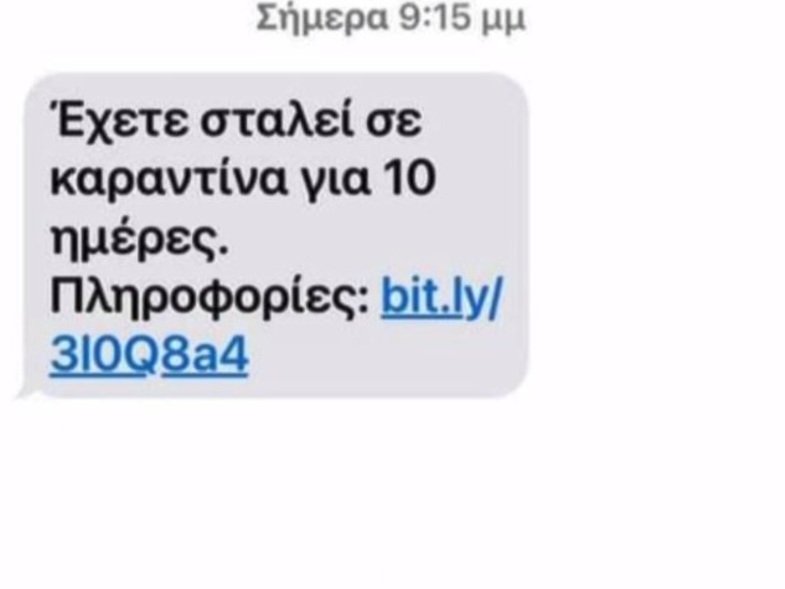 Οι πολίτες λαμβάνουν sms που τους ενημερώνουν ότι μπαίνουν σε καραντίνα. Ωστόσο, η απάτη με sms είναι εμφανής καθώς η σύνταξη του sms μαρτυρά ότι κάτι δεν πηγαίνει καλά, αφού αναφέρει: