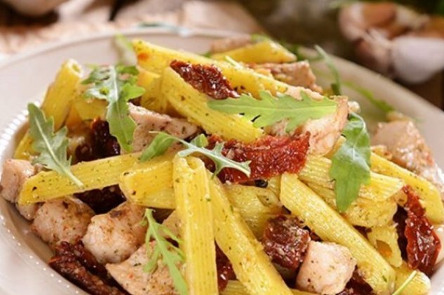 5 Προσθέτουμε τις στραγγισμένες πέννες προσθέτοντας λίγο από το νερό που βράσαμε τα ζυμαρικά και μαγειρεύουμε για 2 λεπτά ακόμη, μέχρι να απορροφηθούν τα υγρά. Ρίχνουμε τις λιαστές ντομάτες και την παρμεζάνα και ανακατεύουμε απαλά να ενωθούν τα υλικά.