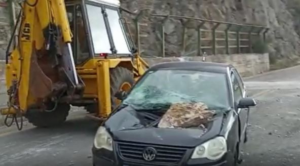 Άγιο είχαν οι επιβάτες που βγήκαν σώοι αλλά σοκαρισμένοι από το αυτοκίνητο – Ο βράχος έπεσε μετά από κατολίσθηση και διέλυσε το μπροστινό μέρος του οχήματος