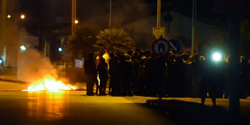 Το συγκεντρωμένο πλήθος των Ρομά έχει ανάψει φωτιές στο οδόστρωμα, ενώ η κυκλοφορία των οχημάτων διεξάγεται μέσω παρακαμπτήριων οδών.