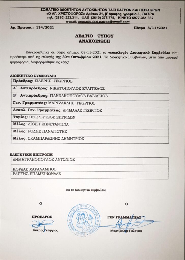 ΕπικαιρότηταΝέο Δ.Σ. στο Σωματείο Ταξί Πάτρας – Πρόεδρος ο Γ. Σιδέρης by 4press9 Νοεμβρίου 20219 Νοεμβρίου 2021 Share0