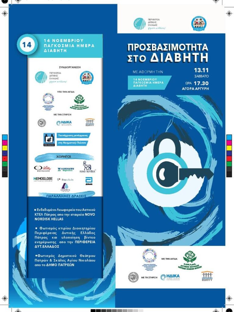 Η Διεθνής Ομοσπονδία Διαβήτη (IDF) αφιερώνει την Παγκόσμια Ημέρα για τα έτη 2021-2023 στην Πρόσβαση στην Φροντίδα του Διαβήτη. Η δράση πραγματοποιείται και υπό την Αιγίδα της Πανελλήνιας Ομοσπονδίας Σωματείων – Συλλόγων Ατόμων με Σακχαρώδη Διαβήτη (ΠΟΣΣΑΣΔΙΑ) και της ΠΟΜΑμεΑ Δυτ. Ελλάδος & Νοτίων Ιονίων Νήσων και με τη στήριξη του Δήμου Πατρέων της ΗΔΙΚΑ και του ΕΟΠΠΥ.