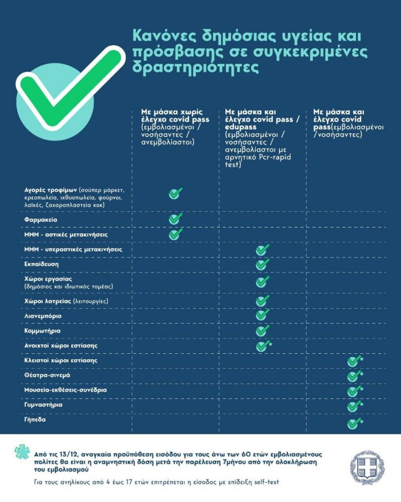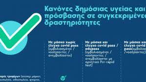 Στα καταστήματα λιανικού εμπορίου, στους ανοικτούς (εξωτερικούς) χώρους εστίασης, στα κομμωτήρια, στους χώρους παροχής υπηρεσιών αισθητικής και άλλους χώρους με συναφείς δραστηριότητες ή παροχής υπηρεσιών δυνατότητα πρόσβασης έχουν οι εμβολιασμένοι ή εντός των τελευταίων έξι μηνών νοσήσαντες από τη νόσο COVID-19 και οι ανεμβολίαστοι ενήλικοι συμπολίτες μας που έχουν υποβληθεί σε διαγνωστικό έλεγχο με PCR ή rapid test πριν από την παρουσία τους στο κατάστημα.