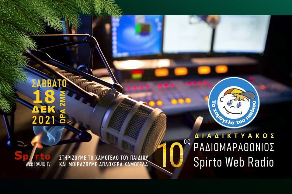 Γιατί ” Χωρίς εσένα δεν γίνεται “!!!Ο 10ος ΡΑΔΙΟΜΑΡΑΘΩΝΙΟΣ στο SpIrto web Radio, είναι και φέτος αφιερωμένος στο @Το Χαμόγελο του Παιδιού στηρίζοντας το και βάζοντας στόχο να χαρίσουμε και πάλι όσο το δυνατόν περισσότερα χαμόγελα στα παιδιά…18 ΔΕΚΕΜΒΡΙΟΥ 2021 στις 2 η ώρα νταν – το μεσημέρι ε…??? – και για όσο εσείς μας κρατήσετε, θα είμαστε στον αέρα, σε LIVE μετάδοση…Τα μικρόφωνα ανοίγουν, οι παραγωγοί μας εναλλάσσονται, το ίδιο και οι καλεσμένοι μας.Μείνετε διασυνδεδεμένοι μαζί μας στο SpIrto Web Radio, όπου θα σας κρατήσουμε συντροφιά, με μουσικό πρόγραμμα και καλεσμένους, ζητώντας την συμμετοχή σας, για να ενισχύσουμε, όλοι μαζί, την δράση ενός φορέα, που χρόνια τώρα επιτελεί ένα σπουδαίο έργο: ΤΟ ΧΑΜΟΓΕΛΟ ΤΟΥ ΠΑΙΔΙΟΥΔΕΙΤΕ ΠΩΣ ΜΟΙΡΑΖΟΥΜΕ ΧΑΜΟΓΕΛΑ ΣΤΑ ΠΑΙΔΙΑ* Καλύψτε μία από τις ανάγκες του Οργανισμού στο https://www.hamogelo.gr/gr/el/crowdfunding/* Αποκτήστε τα χριστουγεννιάτικα δώρα σας από το eshop του Χαμόγελου https://www.hamogelo.gr/gr/el/eshop/epochiaka/* Μπορείτε να επισκεφθείτε ένα από τα bazaar του Χαμόγελου. Πληροφορίες στο παρακάτω https://www.hamogelo.gr/…/christougenniatika-vazaars…/* Μέσω πάγιας εντολής: Καλέστε στο 11040 για να ενημερωθείτε για τη διαδικασία καταχώρησης πάγιας εντολής εύκολα και με ασφάλεια.
