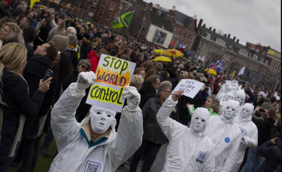 Ομάδα διαδηλωτών με λευκές φόρμες και λευκές μάσκες κρατούσαν πλακάτ, στα οποία αναγραφόταν: «Δεν πρόκειται για ιό, πρόκειται για έλεγχο» και «Σταματήστε να ελέγχετε τον κόσμο».