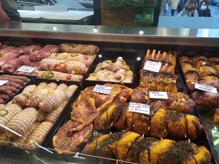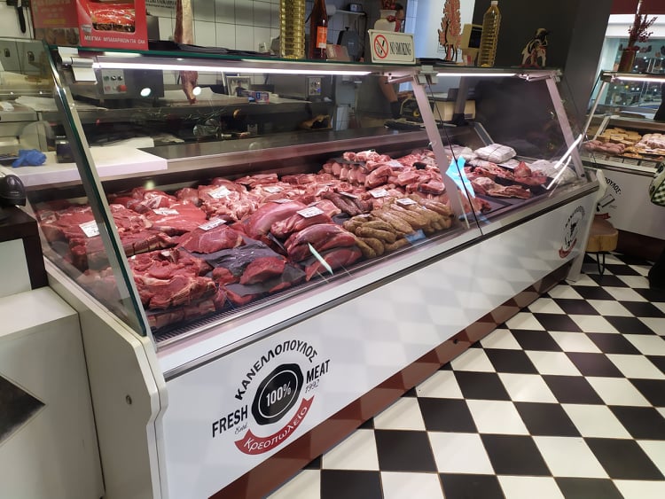 Κρέατα εξαιρετικής ποιότητας που παρασκευάζονται κατόπιν παραγγελίας, κοτόπουλα, μοσχαράκι από επιλεγμένες φάρμες της Αχαΐας και παραγωγής Κανελλόπουλου, επιλεγμένα προϊόντα και διάφορα είδη στα ράφια.