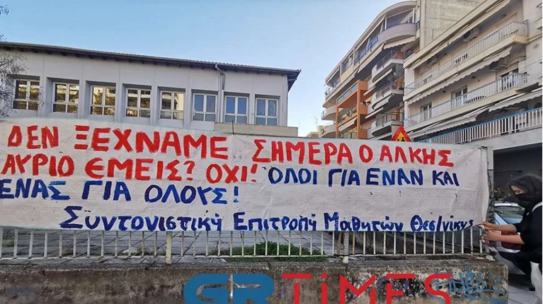 Μαθητές από διάφορα σχολεία της Θεσσαλονίκης συνεχίζουν να πηγαίνουν στο σημείο της δολοφονίας του 19χρονου Άλκη, ο οποίος άφησε την τελευταία του πνοή επί της οδού Θεοδώρου Γαζή, στην περιοχή της Χαριλάου.