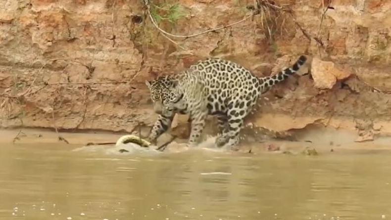 Μία ασυνήθιστη μάχη καταγράφηκε πριν από λίγους μήνες, στις όχθες ενός ποταμού στην Βραζιλία, καθώς ένας ιαγουάρος αντιμετώπισε ένα φίδι τουλάχιστον δύο μέτρων.