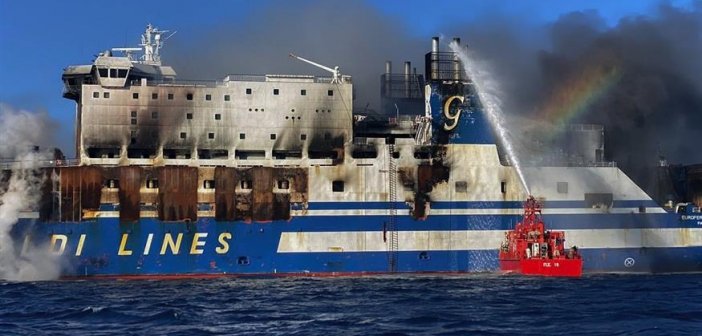 Η φωτιά στο γκαράζ του πλοίου, άρχισε να καταστρέφει ό,τι είχε απομείνει, με τις προσπάθειες της κατάσβεσης να βρίσκονται σε εξέλιξη μέχρι και το απόγευμα.
