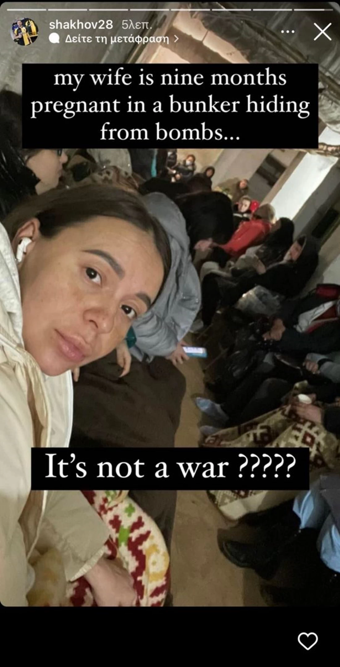 Ο ποδοσφαιριστής της ΑΕΚ δημοσίευσε στο προσωπικό του λογαριασμό στο Instagram αρκετά story σχετικά με την κατάσταση στη χώρα του. Μάλιστα ανέβασε και τη σύζυγό του και έγραψε: “Η γυναίκα μου είναι έγκυος εννέα μηνών σε ένα καταφύγιο που κρύβεται από βόμβες… Δεν είναι πόλεμος;”.
