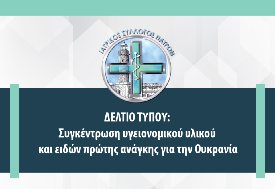 Το Διοικητικό Συμβούλιο του Ιατρικού Συλλόγου Πατρών κατόπιν των δυσάρεστων γεγονότων του πολέμου στην Ουκρανία και των δυσμενών συνεπειών που επιφέρει στον άμαχο πληθυσμό αποφάσισε τη συλλογή υγειονομικού υλικού & ειδών πρώτης ανάγκης (τρόφιμα, ρουχισμό) προκειμένου να αποσταλούν στο λαό της Ουκρανίας. Ενδεικτικά τα είδη που συλλέγονται: