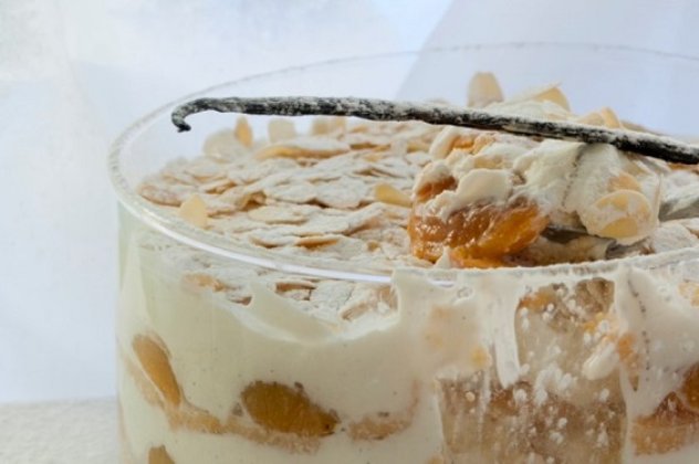 Συνεχίζουμε, τοποθετώντας τα υπόλοιπα σαβαγιάρ, τα βερίκοκα και το γιαούρτι. Γαρνίρουμε με τα αμύγδαλα και το κλωναράκι βανίλιας. Αφήνουμε στην κατάψυξη για λίγες ώρες.