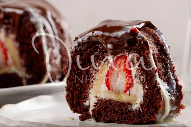 - Βγάζω το κέικ από το ψυγείο, το αναποδογυρίζω σε μια πιατέλα και καλύπτω με την σάλτσα σοκολάτας. Λιώνω τη λευκή σοκολάτα και διακοσμώ με γραμμές (μπορείτε να χρησιμοποιήσετε ένα πηρούνι). Κόβω το κέικ και σερβίρω.