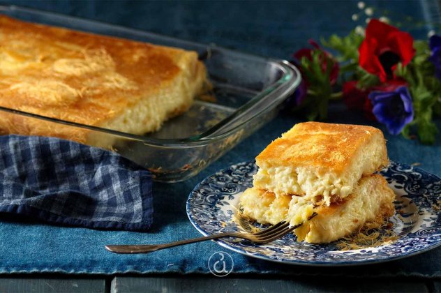 - Ανοίγουμε – αφρατεύουμε το άλλο μισό κανταΐφι και καλύπτουμε την πίτα.