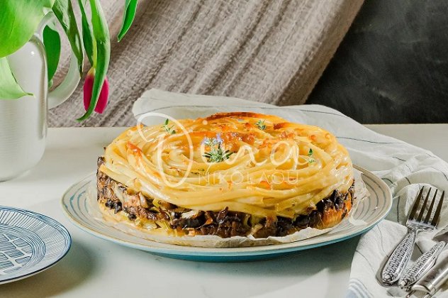 Αλείφω στρογγυλή φόρμα διαμέτρου 24 εκ. με ελαιόλαδο. Στρώνω τη μισή ποσότητα μακαρονιών, απλώνω την γέμιση με τα μανιτάρια και στρώνω και τα υπόλοιπα μακαρόνια. Όσο από το μείγμα των αυγών μείνει στο μπολ το αδειάζω επάνω στην πίτα.