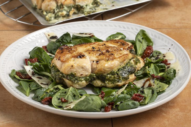 - Σερβίρουμε τα στήθη του κοτόπουλου μαζί με τη σαλάτα.