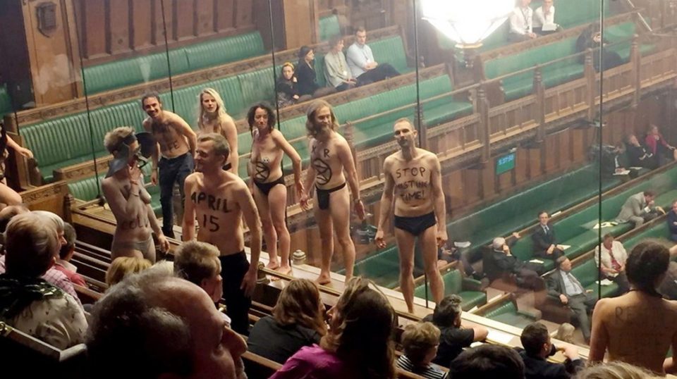 Ακτιβιστές μπήκαν με τα εσώρουχα και διέκοψαν συζήτηση για το Βrexit στη Βουλή των Κοινοτήτων, γυρίζοντας τα οπίσθιά τους προς την αίθουσα της ολομέλειας, για περίπου 20 λεπτά. Οι βουλευτές προσπάθησαν να συνεχίσουν τη συζήτηση, παρά την ειρηνική διαμαρτυρία που έγινε για την κλιματική αλλαγή, αλλά οι περισσότεροι αναφέρθηκαν και στην παρουσία των 11 ημίγυμνων ανδρών και γυναικών.