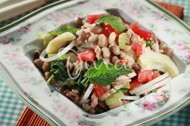 Αν θέλουμε να δώσουμε μεγαλύτερη ένταση σε αυτό το σαλατοφαγητό, μπορούμε να προσθέσουμε μερικά φιλετάκια μαριναρισμένου γαύρου (ή μερικές αντσούγες σε λάδι, στραγγισμένες), κομμένα στη μέση, λίγο πριν το σερβίρισμα