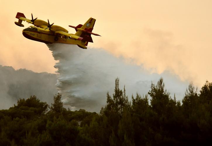 Οι φλόγες ενισχύονται από τους ανέμους που πνέουν στην περιοχή ενώ δεν απειλούνται κατοικημένες περιοχές.