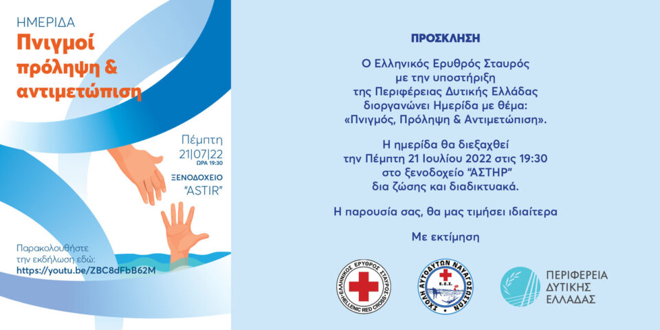 O Ελληνικός Ερυθρός Σταυρός σε συνεργασία με την Περιφέρεια Δυτικής Ελλάδας , με αφορμή την Παγκόσμια Ημέρα Πρόληψης Πνιγμών, διοργανώνει, την Πέμπτη 21 Ιουλίου 2022, στο ξενοδοχείο «ΑΣΤΗΡ» (Πάτρα) και ώρα 19:30, ενημερωτική ημερίδα για την πρόληψη & αντιμετώπιση των πνιγμών στην Ελλάδα.
