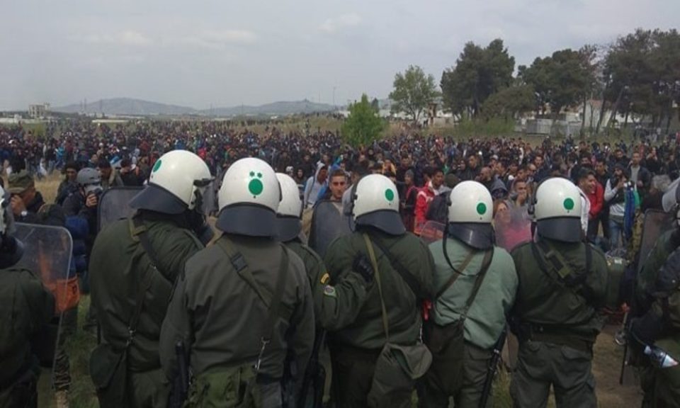 Γυναίκες προσπαθούν να σπάσουν τον αστυνομικό κλοιό με τα μωρά τους στα χέρια, παιδιά κλαίνε ενώ ορισμένοι έχουν ανάψει φωτιά στα χόρτα μπροστά από τους αστυνομικούς , σύμφωνα με όσα αναφέρει το Αθηναϊκό Πρακτορείο Ειδήσεων.
