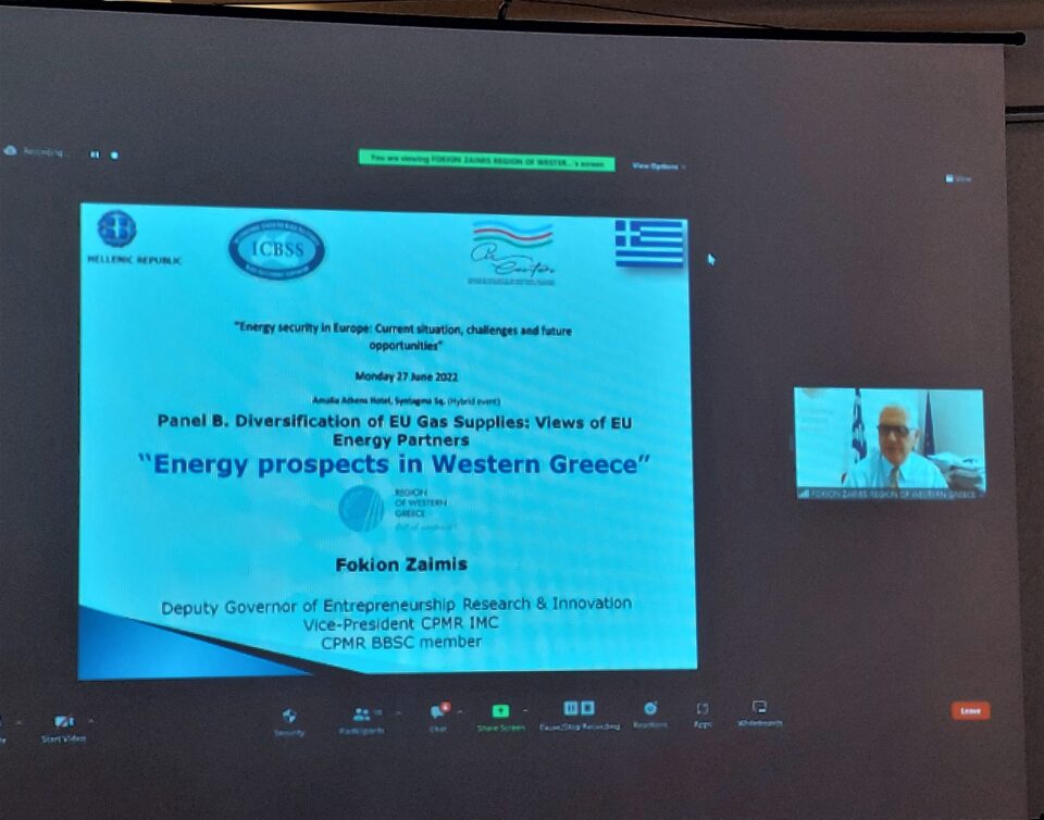 Ο Αντιπεριφερειάρχης επιχειρηματικότητας Έρευνας και Καινοτομίας, Φωκίων Ζαΐμης συμμετείχε διαδικτυακά στην εκδήλωση του Διεθνούς Κέντρου Μελετών Ευξείνου Πόντου (ΔΙΚΕΜΕΠ) και του Κέντρου Ανάλυσης του Διεθνών Σχέσεων (AIR Center) του Αζερμπαϊτζάν με θέμα η «Ενεργειακή ασφάλεια στην Ευρώπη: Τρέχουσα κατάσταση, προκλήσεις και μελλοντικές ευκαιρίες» που έγινε πρόσφατα στην Αθήνα.