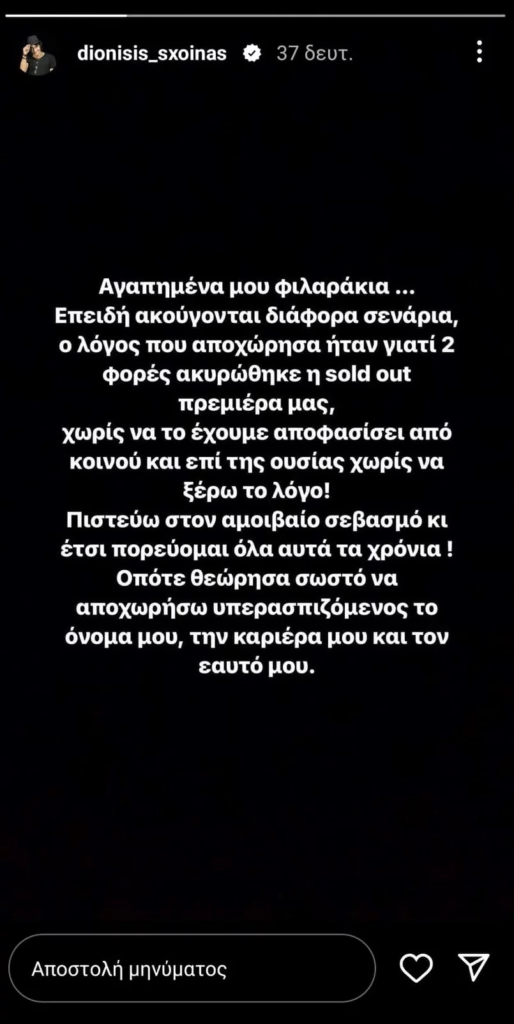 «Αγαπημένα μου φιλαράκια. Επειδή ακούγονται διάφορα σενάρια, ο λόγος που αποχώρησα ήταν γιατί 2 φορές ακυρώθηκε η sold out πρεμιέρα μας, χωρίς να το έχουμε αποφασίσει από κοινού και επί της ουσίας χωρίς να ξέρω το λόγο! Πιστεύω στο αμοιβαίο σεβασμό κι έτσι πορεύομαι όλα αυτά τα χρόνια! Οπότε θεώρησα σωστό να αποχωρήσω υπερασπιζόμενος το όνομά μου, την καριέρα μου και τον εαυτό μου», έγραψε ο Διονύσης Σχοινάς.