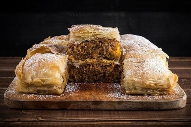- Προσθέτουμε τη γέμιση και επαναλαμβάνουμε τη διαδικασία με τα υπόλοιπα φύλλα και το υπόλοιπο λιωμένο βούτυρο.