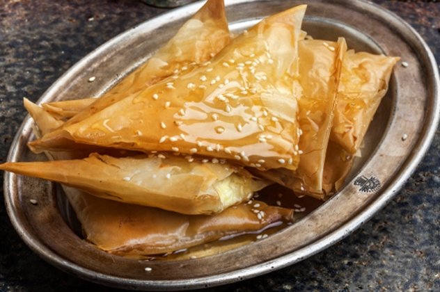 Παίρνουμε μια λωρίδα φύλλο κρούστας και αλείφουμε με ελαιόλαδο την επιφάνειά της. Βάζουμε μια μικρή ποσότητα γέμισης στην άκρη. Διπλώνουμε την κάτω δεξιά γωνία πάνω στο φύλλο, σχηματίζοντας τρίγωνο. Συνεχίζουμε το δίπλωμα μέχρι το τέλος.