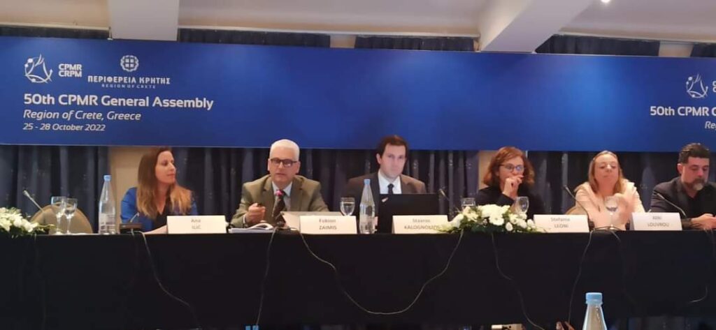 Ο Αντιπεριφερειάρχης Επιχειρηματικότητας Έρευνας και Καινοτομίας και Αντιπρόεδρος της Διαμεσογειακής Επιτροπής της CPMR, Φωκίωνας Ζαΐμης, συμμετείχε στη 50η Γενική Συνέλευση της CPMRπου πραγματοποιήθηκε στην Κρήτη το διάστημα 25-28 Οκτωβρίου 2022. Συζητήθηκαν θέματα σχετικά με την νεότητα, το κλίμα, τη γαλάζια οικονομία, τα λιμάνια, τις μεταφορές, το μεταναστευτικό, την πολιτική συνοχής, τα ευρωπαϊκά έργα, το μέλλον της CPMR, διοικητικά και οικονομικά θέματα κ.ά.