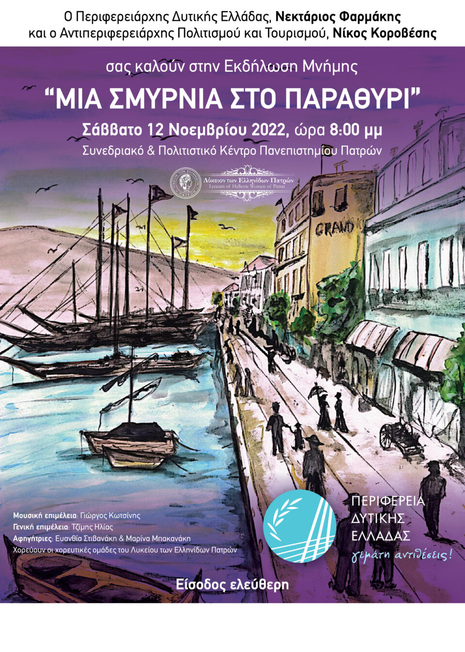 Πρόκειται για μια εκδήλωση μνήμης και τιμής στη Μητρόπολη του Μικρασιατικού Ελληνισμού. Με όχημα τη μουσική και το χορό οι χορευτικές ομάδες του Λυκείου Ελληνίδων της Πάτρας με την αμέριστη υποστήριξη της Περιφέρειας Δυτικής Ελλάδας, του Περιφερειάρχη, Νεκτάριου Φαρμάκη και του Αντιπεριφερειάρχη Πολιτισμού και Τουρισμού, Νίκου Κοροβέση, θα ανακαλέσουν στη μνήμη μας στιγμές που αναδεικνύουν την ιστορικότητα και τον πολιτισμικό πλούτο των Σμυρνιών, υπενθυμίζοντας ταυτόχρονα τη σημαντικότατη συνεισφορά τους στο σύγχρονο ελληνικό πολιτισμό. Την γενική επιμέλεια της παράστασης έχει ο Δημήτρης Ηλίας. Η είσοδος θα είναι ελεύθερη για το κοινό.